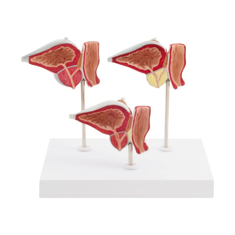 The 3-part prostate model from HeineScientific shows a normal, healthy prostate and, for comparison, two diseased prostates–one with hyperplasia and one with cancerous glandular tissue. The prostate disease model is particularly suitable for patient education and therapy consultation. The models also show the rectum and bladder to give a clear representation of the anatomy of the prostate.