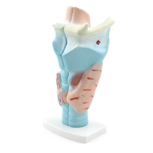 This 3-piece larynx model represents the human larynx in 3x magnification and, thanks to median sections, enables a detailed look at deeper layers. The different structures in this larynx model are coloured differently for a better overview. The larynx model with the dimensions 8 x 12 x 25 cm is delivered on a white base; the central element is firmly mounted, two parts of the anatomical model are removable.