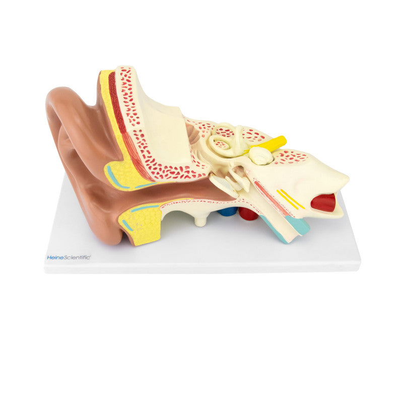 This ear model from HeineScientific shows the human ear, 3x enlarged. The outer, middle and inner ear is represented in great detail. This 4-part model is excellent as a visual aid for school lessons or patient consultations in the ENT practice.
