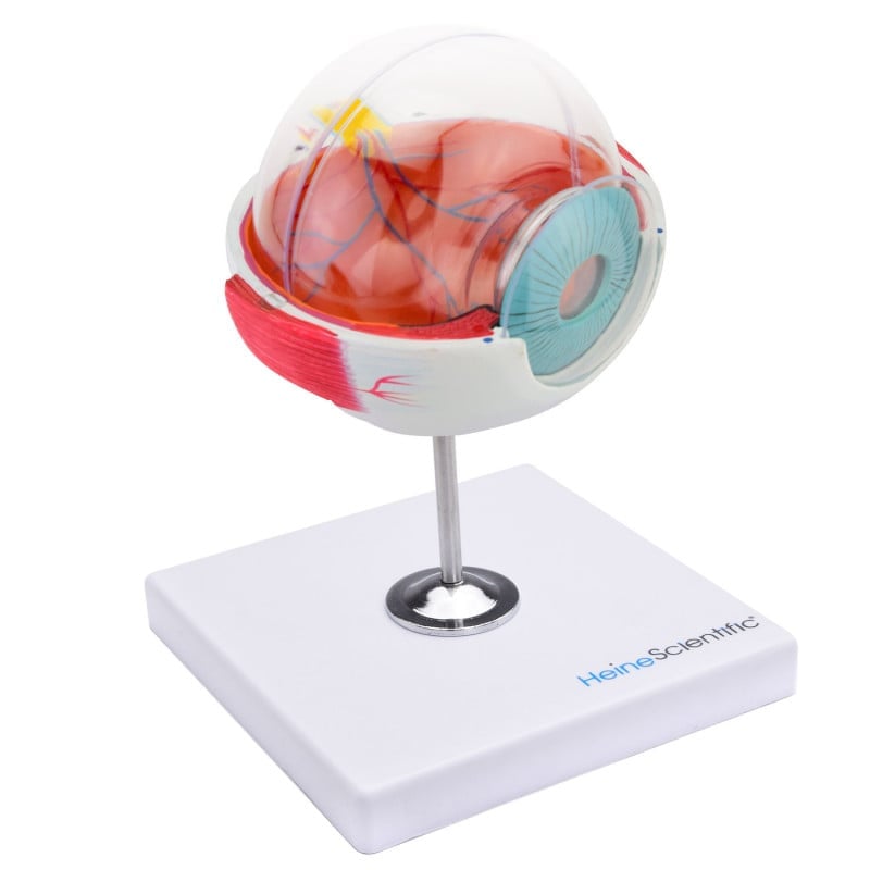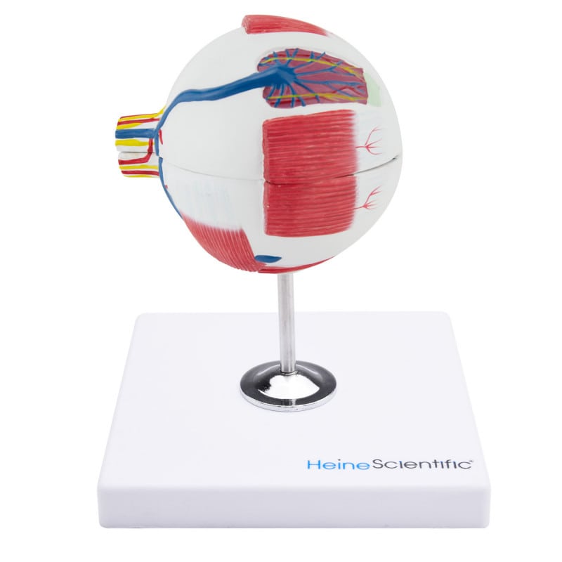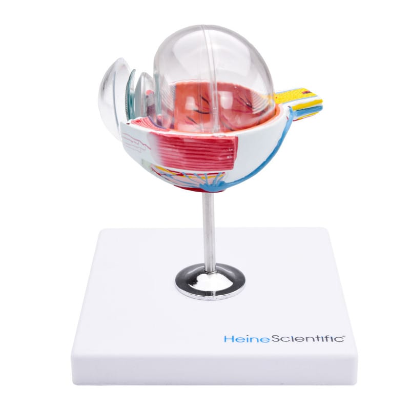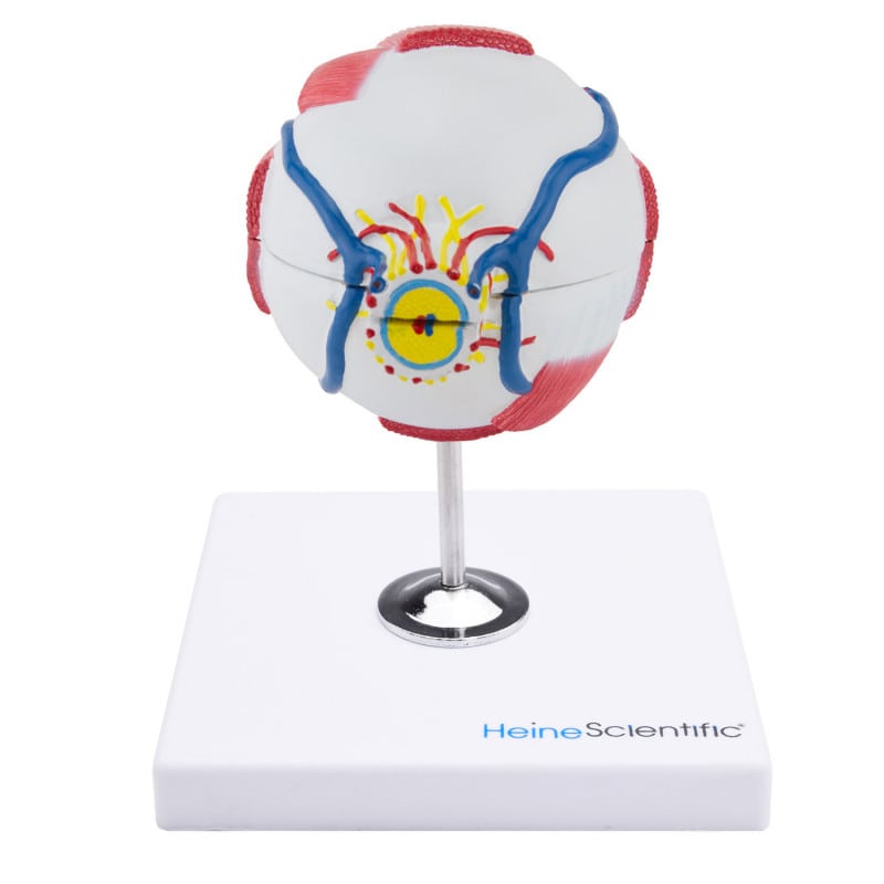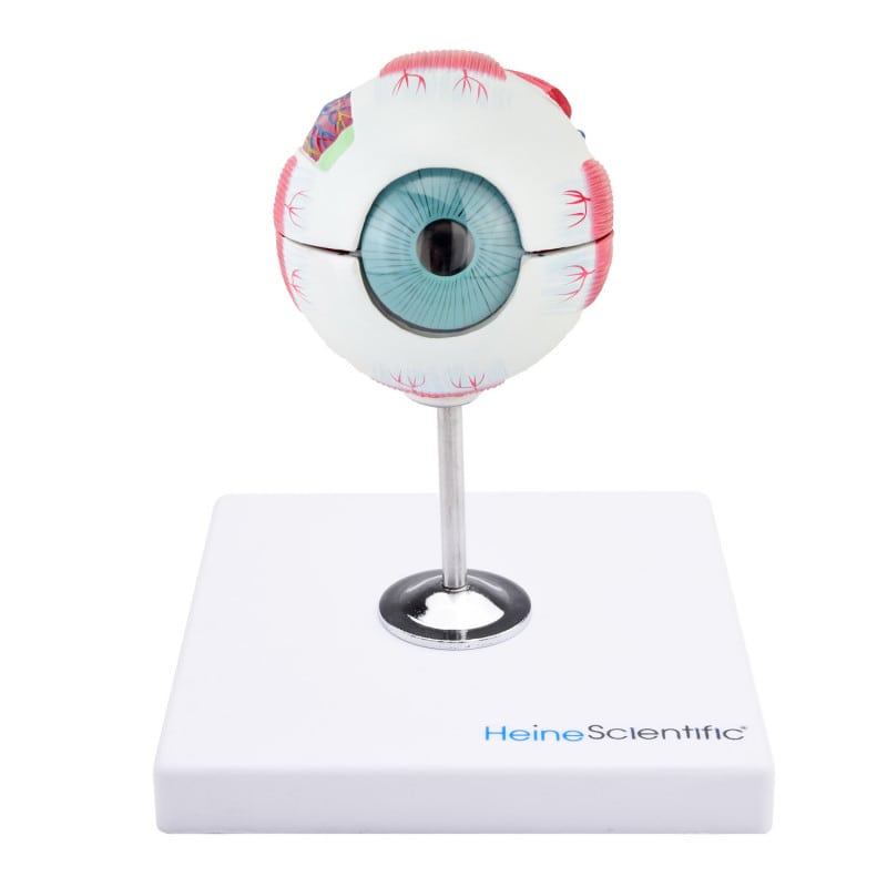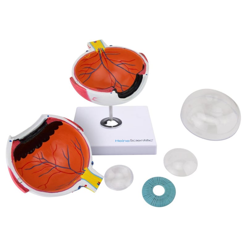 The 6-part eye model from HeineScientific consists of vitreous body, lens, iris, cornea and eyeball. The eyeball of the large eye model can additionally be divided into 2 parts so that the inner structures are visible. The elaborate colouring of the eye favours the optical differentiation of the structure of the individual anatomical structures. For this reason, the model is perfect as a teaching aid for anatomy at schools and universities or for patient education in doctor's surgeries.