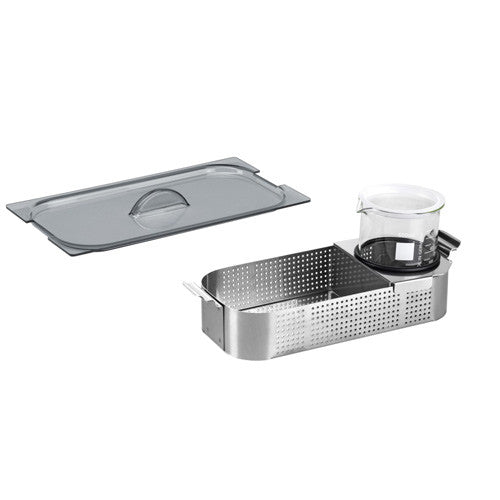 Complete accessories set for the New Eurosonic 4D ultrasonic cleaner by Euronda. This set contains the stainless steel hanging basket, a transparent plastic cover, a beaker holder for 1 cup, and the matching glass beaker. The hanging basket safely holds any large instruments or prostheses that require cleaning. In combination with the cup holder and the matching glass cup, you can clean e.g. instruments, prostheses, impressions trays or orthodontic devices directly in the basket, and clean rotating instruments separately, indirectly and hygienically in the glass cup.