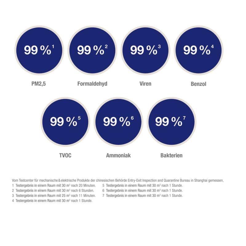 - 1 air purifier incl. pre-filter, HEPA filter, activated carbon filter and platinum catalyst