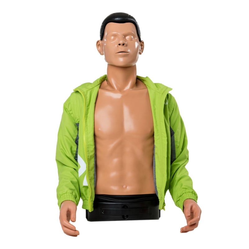 The AmbuMan® Instrument training manikin for advanced BLS algorithm training is perfect for basic training of medical and nursing staff, but also for laypersons. Thanks to the adjustable thoracic strength, it allows optimal training of thoracic compression and offers realistic breathing resistance and exhalation through the mouth and nose. As it is possible to place defibrillation electrodes on the closed torso, the training device is also ideally suited for the use of a training AED.