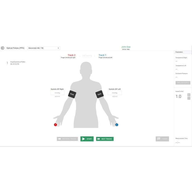 This enables not only thoracic outlet syndrome tests, but also assists in the evaluation of various arterial circulatory disorders. After applying the sensors and cuffs, the measurement starts automatically. Highly sensitive pressure sensors and precise algorithms ensure detailed and virtually unfiltered display of pulse curses. The system can be upgraded for venous examinations if required.