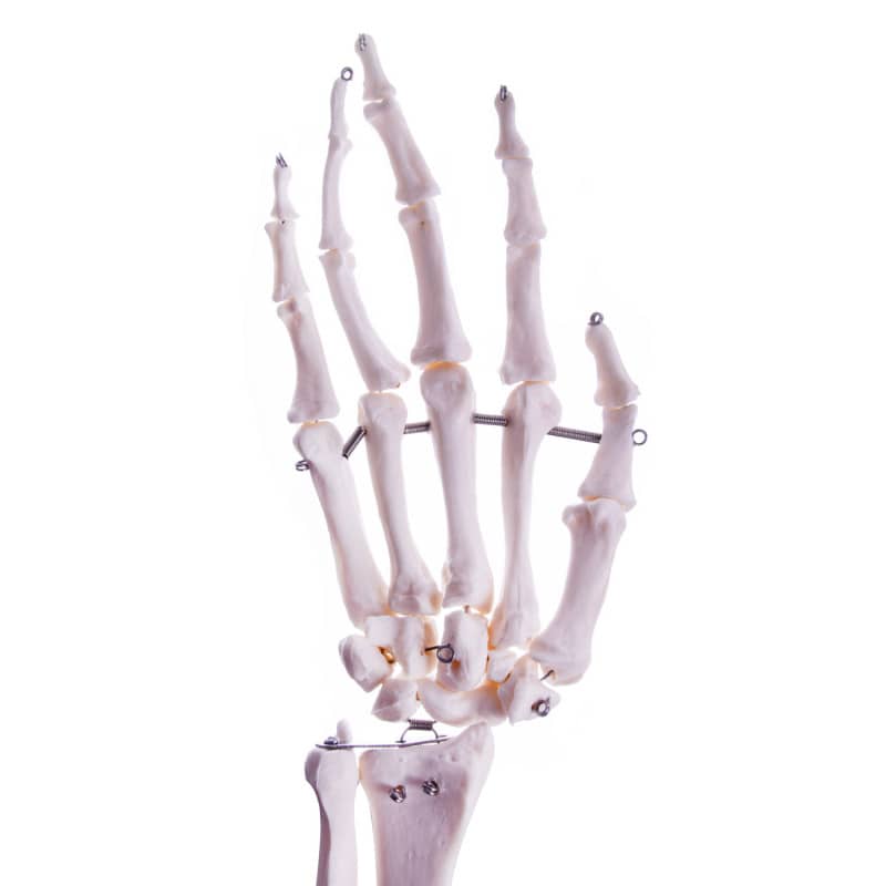 The HeineScientific arm skeleton shows the detailed bone structure of an upper limb from the knuckles to the humeral head. The individual bones are connected with each other by wires allowing them to be moved to some extent.