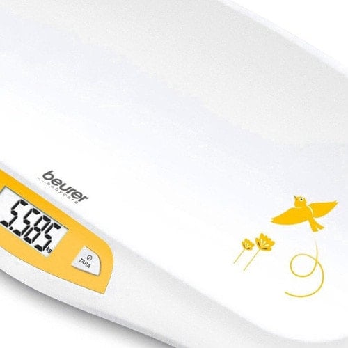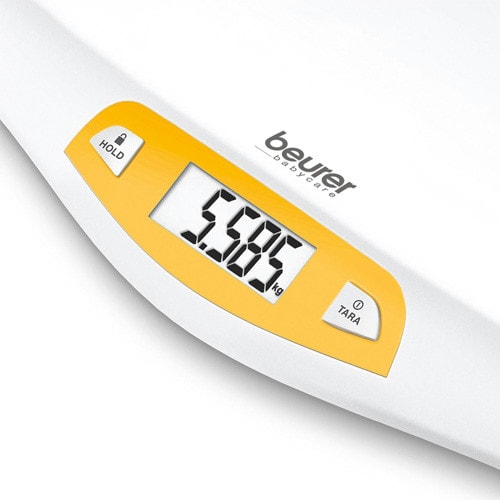 The Beurer BY80 baby scale can be used to weigh newborns and babies up to a weight of 20kg. Thanks to the automatic hold function, the weight can also be easily read with struggling babies. The tare function allows the baby to be weighed on a cover or similar item. This battery-operated baby scale with a cute, printed motif has a large, easy-to-read display and is easy to clean.