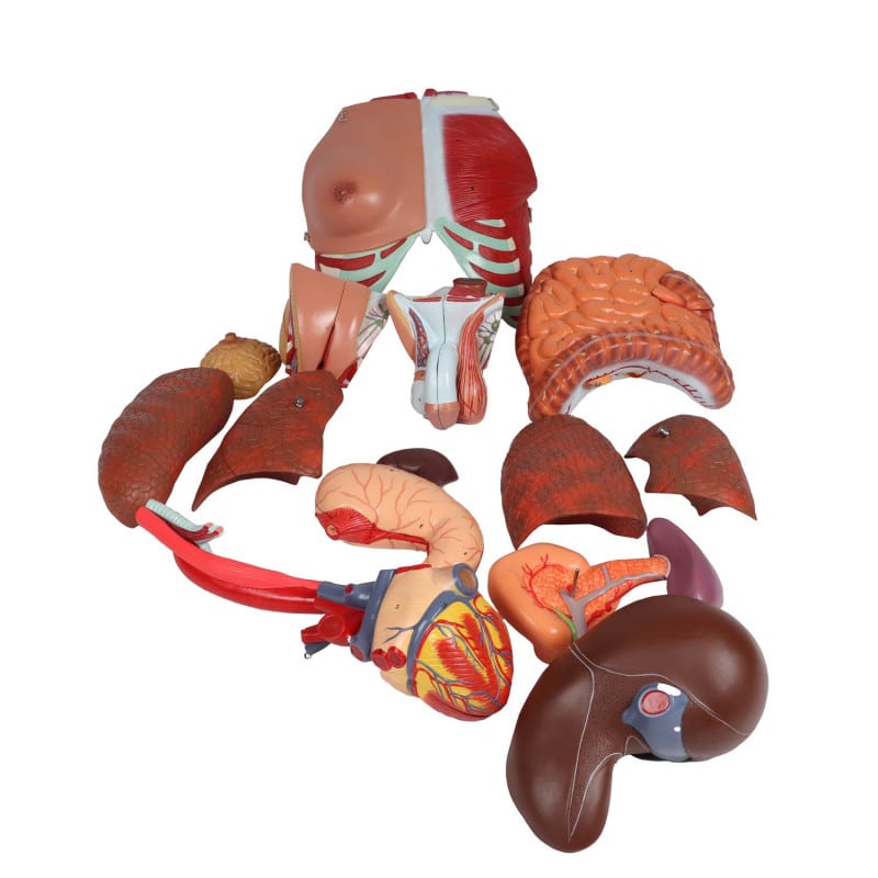 The Bisexual Torso with Open Back from Erler Zimmer is a life-sized model that offers a highly realistic representation of the human body. The model consists of 28 detachable parts and provides full accessibility to all body systems. All important anatomical structures are clearly depicted. This model is recommended for medical training and education. The easy interchangeability of the urogenital systems allows for a detailed bisexual anatomical representation.