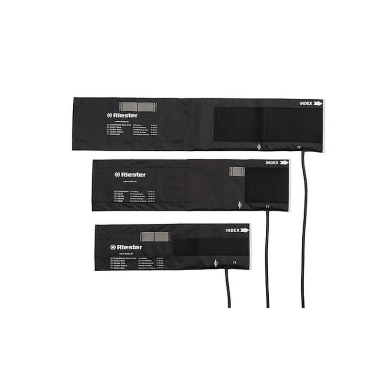 Latex-free blood pressure cuff for use with the Riester R1 shock-proof. You get the upper arm cuff with Velcro fastener optionally for newborns (15 cm), babies (23 cm), children (35.5 cm) or adults (70 cm - extra large) or adults (54.5 cm).