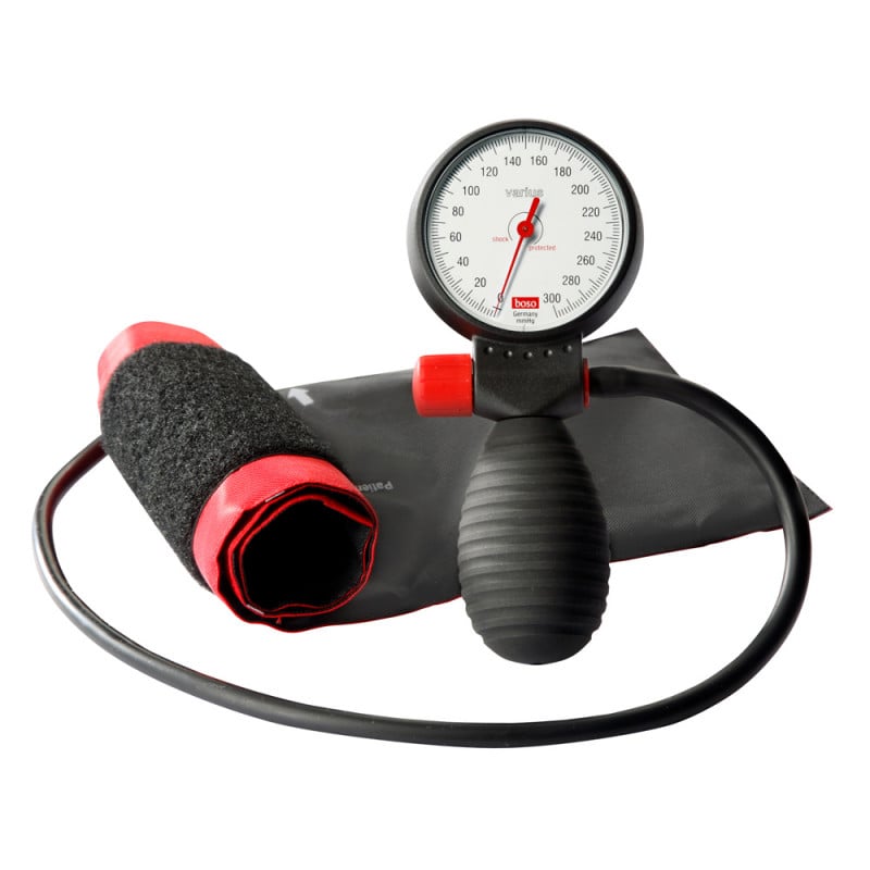 The boso varius is a basic sphygmomanometer used for manual blood pressure measurement. The device is equipped with a 60 mm scale, has a release valve and a connection for blood pressure cuffs. The shock protection technology assures the boso varius will easily withstand falls from average heights (e.g. from a table).