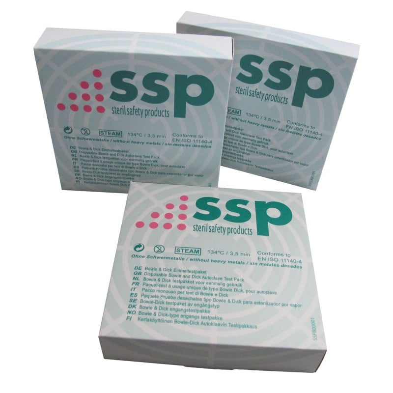The Bowie Dick test complies with DIN EN ISO 11140-40 and is used for daily checking of air removal and steam penetration in the autoclave. The purpose of the function test is to ensure that sterilisation takes place under the desired conditions. The test is user-friendly and results can be read immediately.