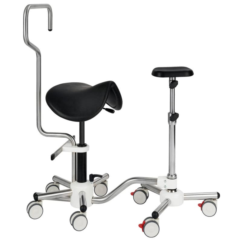 This saddle stool and leg rest combination is great for treatment rooms in the clinic, surgery and care facilities, as it offers benefits for the patient and treating personnel. The ergonomically optimised positioning of the doctor respective to the patient's extremity that is being treated offers back-friendly work. The wide adjustment possibilities of the components and the comfortable PU foam on the leg rest provides the patient additional comfort. The arm/leg rest is height adjustable from 83-110 cm and the horizontal positioning between the seat and rest is adjustable by 19 cm.
