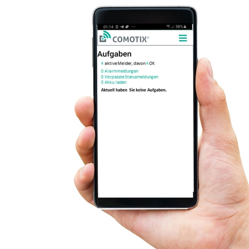 The COMOTIX® app was specially designed to make monitoring data available to the user anytime and anywhere. Data is transmitted in encrypted form via the mobile network, so that detailed and clear logs can be viewed in the app. In the event of an alarm or malfunction, the user is immediately informed via push notification.