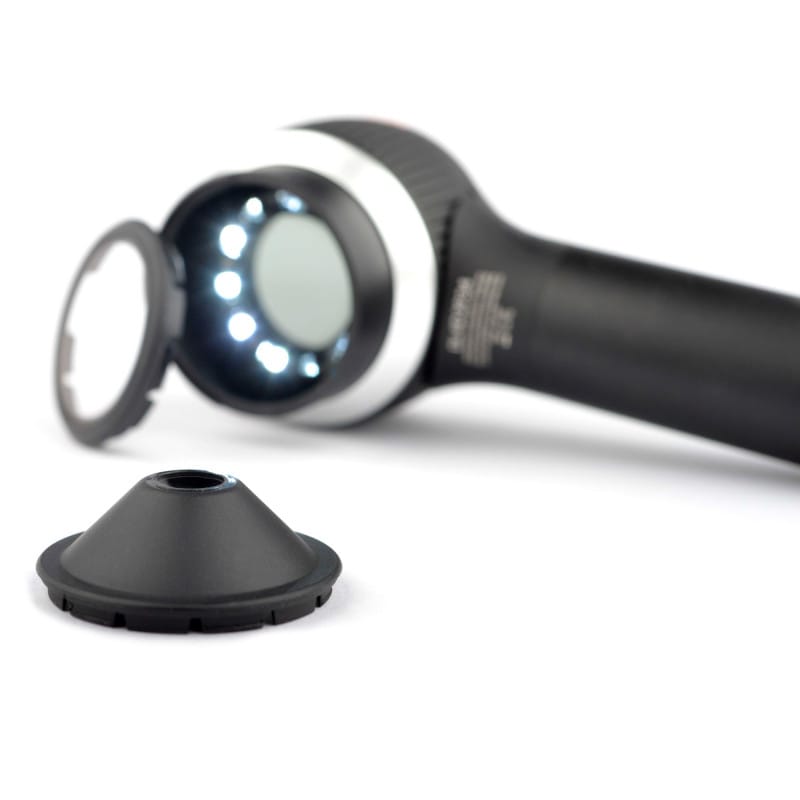 The contact plate for small areas can be used with all DermLite DL4 models and allows for the examination of concave body parts with immersion fluids. The integrated reticle facilitates the documentation of the skin lesion's size.