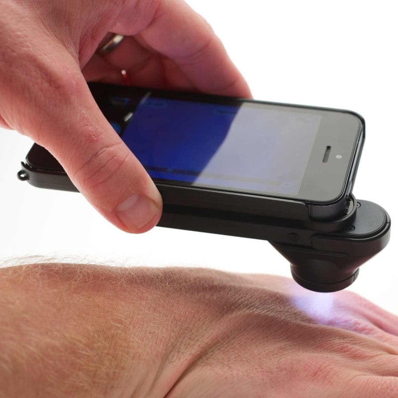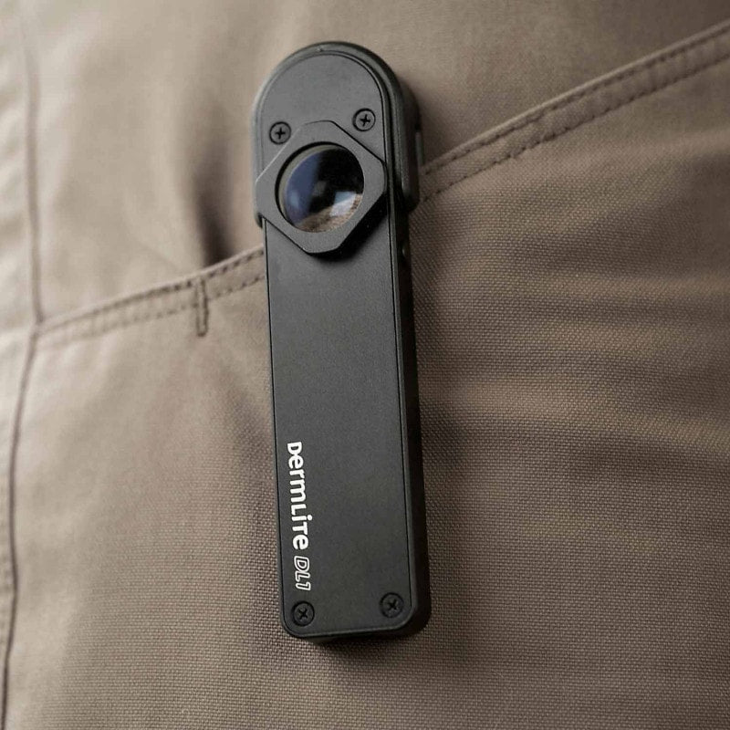 The DermLite DL1 is roughly the size of a stick of gum. Its 15 mm lens and powerful LED illumination enable excellent picture quality. The magnetic adapter allows the dermatoscope to be attached to any smartphone or tablet for image capture