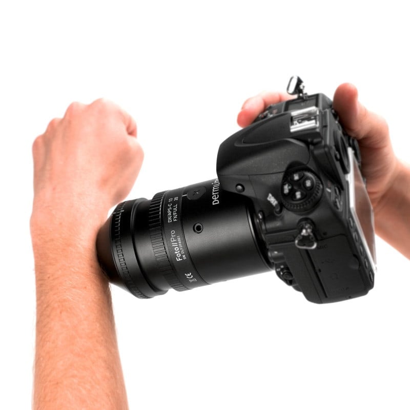 The DermLite Foto II Pro with Nikon D500 serves the creation of high-quality dermatoscopic images. The dermatoscopy lens is equipped with a 6-lens design, zoom and automatic polarisation change. The field of vision is illuminated by a ring of bright LEDs and two high-performance Li-polymer batteries. The diameter of the field of vision can be adjusted between 9 mm (for typical lesions) and 20 mm.