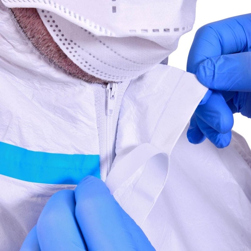 The protective overall is equipped with tight fitting elastic cuffs on the arms and legs, a hood with elastic band and spray-resistant seams. With a density of 55g/m2, the material offers reliable protection against liquid chemicals, infectious agents and electrostatic discharge.