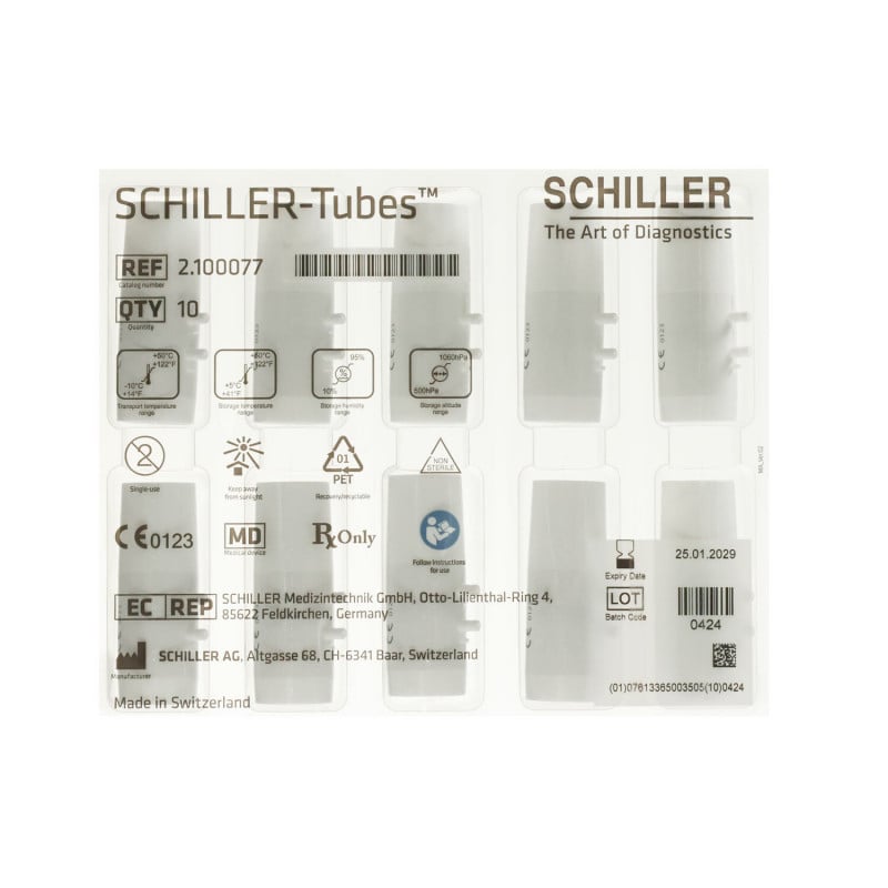 The Schiller disposable plastic mouthpieces are ideal for precise measurements of lung volumes. They are specifically designed for Schiller devices and are compatible with models SP-150, SP-160, and SP-250. The mouthpieces are intended for single use. Each pack contains 10 mouthpieces made from high-quality plastic.
