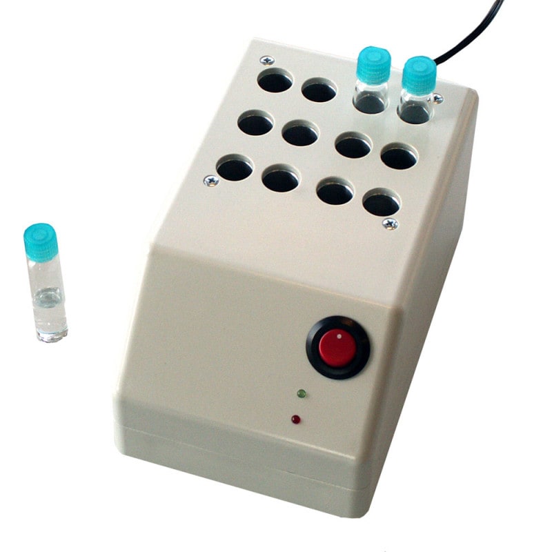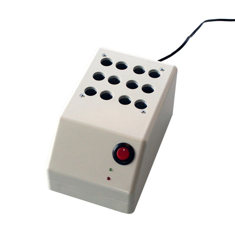 This thermostat is necessary for measuring GOT, GPT, CK, creatinine and CRP, in order to reach a sample temperature of 37 °C. The Diaglobal thermostat needs 20 minutes after switching on to reach the set temperature. After the warm-up time, the temperature control systems indicate readiness for operation via the green LED display. The temperature is preset and calibrated to 37 °C. The temperature controller is located inside the thermostat. It is recommended to have the temperature range changed only by experts. The thermostat is supplied with an AC adapter.