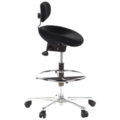 Due to its distinctive contoured seat and particularly thick padding, the ergonomic swivel stool provides for relaxed, comfortable sitting. The deep backrest supports the lumbar spine, thus helping to prevent backache. Both the seat height and the height of the foot ring can be continuously adjusted.