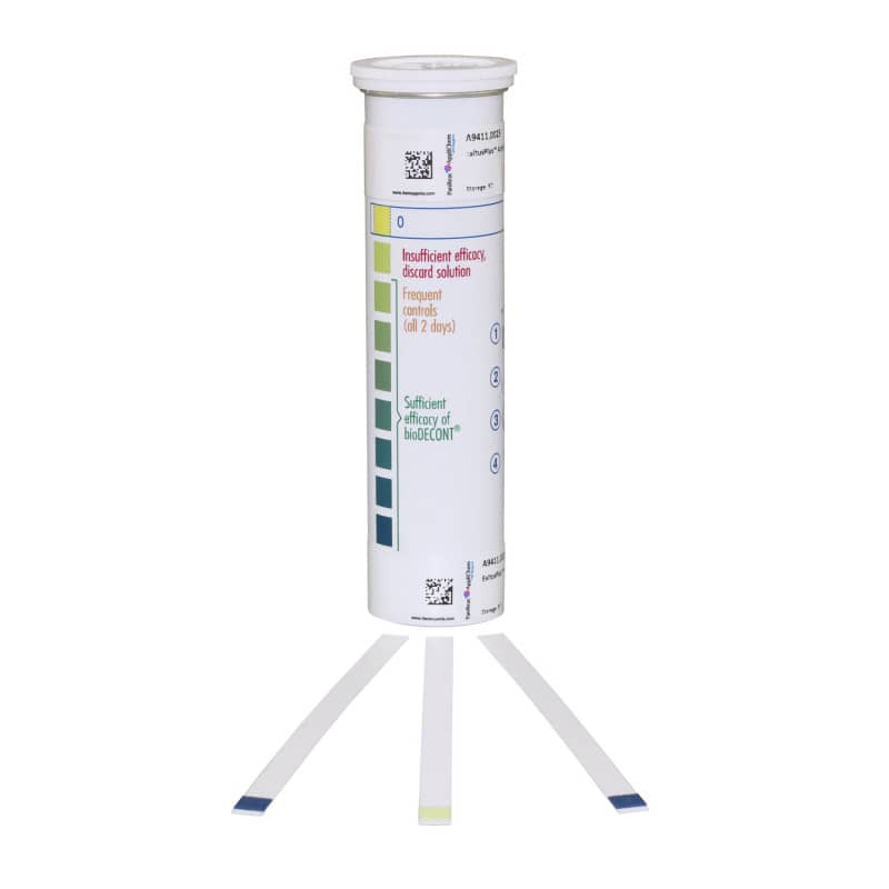 The ExitusPlus™ Activity Test is a practical quick test to check the activity of the decontamination solutions ExitusPlus™ and ExitusPlus™ IF. It is recommended when there are doubts about the activity of the solutions—such as after exceeding the recommended re-test date or after repeated use in decontamination protocols. The test strips are highly sensitive and designed to detect the redox reaction of the ExitusPlus™ solutions. The strips are calibrated to nucleic acid degradation and to ageing of the solutions.