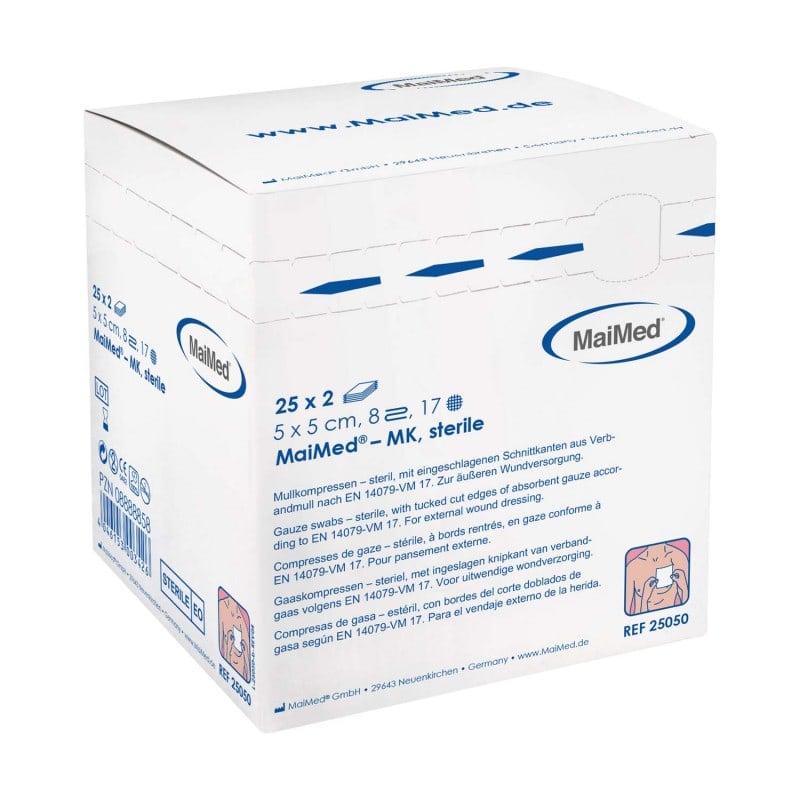 MaiMed® - MK, sterile is a ready-to-use 17-thread gauze compress made of 100 % cotton that complies with DIN EN 14079-VM17. Due to the folded cut edge (ES), the gauze swabs can be used without threads coming loose. MaiMed-MK sterile gauze swabs are characterised by their good absorbency and can be used in many clinical areas.