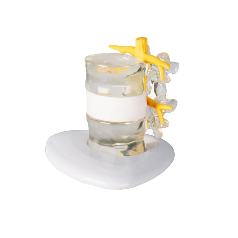The Erler-Zimmer herniated disc simulator is ideal for doctors, osteopaths and chiropractors to demonstrate fast and easily what happens when a patient suffers from a herniated disc. If the two vertebra are pressed together, the inner core of the disc protrudes, forming a hernia. The protruding hernia illustrates the mechanics and the effect on the spinal nerve. The model in schematic representation is enlarged 2-fold and thus ensures particularly easy handling.