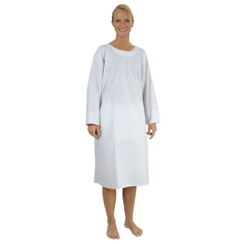 This hospital gown is made of an easy-care cotton mix fabric and is suited for preparing patients for an exam or surgical operation. This adult hospital gown has long sleeves, a rounded neck and is closed in the back with two tie bands.