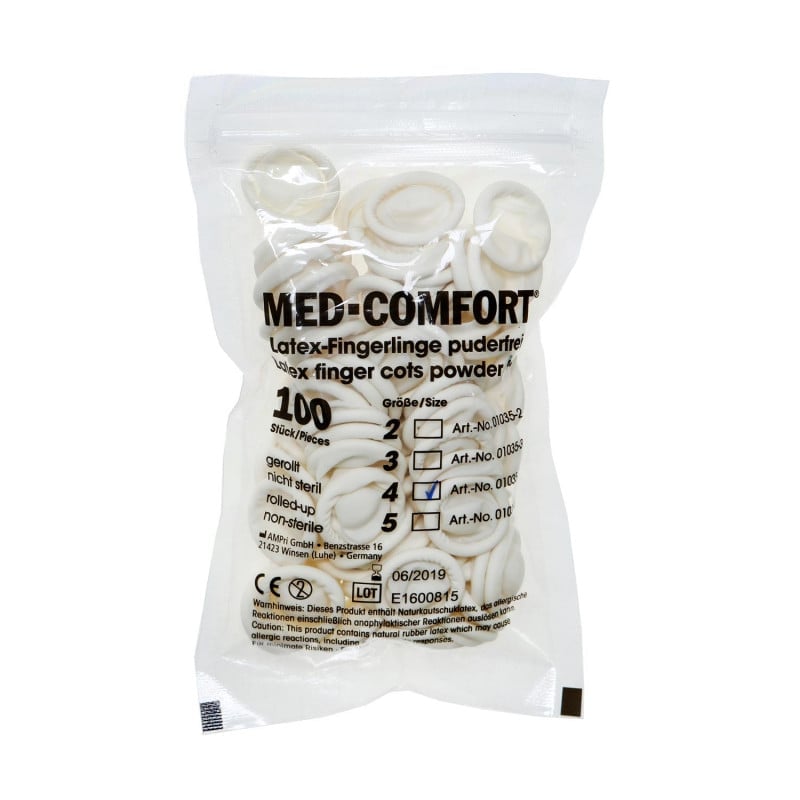 The non-sterile finger cots from AMPri are made from latex, are comfortable to wear and powder-free. They are ideal for examinations where there is no need to protect the whole hand. The gloves can be used for rectal examinations, suppository insertion, ointment application and to inspect the mouth cavity.