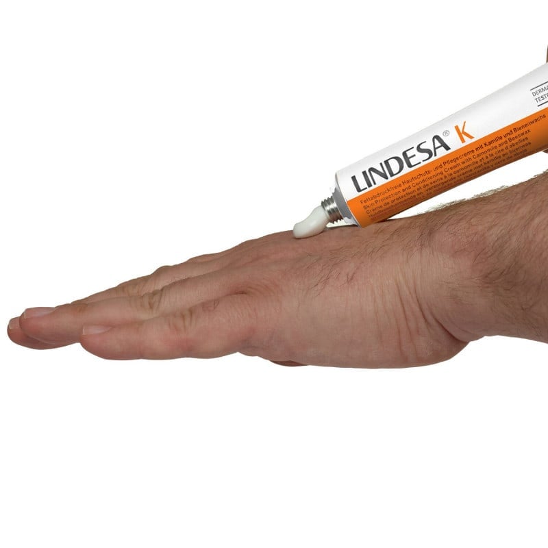 Lindesa K is a fast-absorbing skin protection and care cream that avoids greasy smears. Lindesa skin protection cream strengthens the skin's immune function and prevents skin damage from external stress. It also soothes irritated skin without leaving a greasy film.