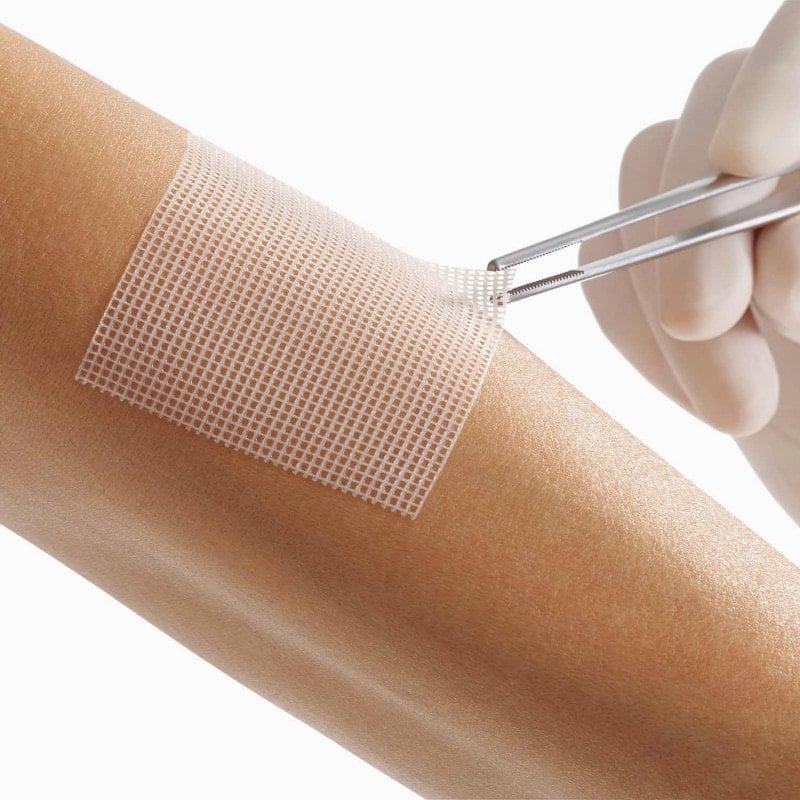 - Net structure allows excess exudate to drain into the secondary dressing