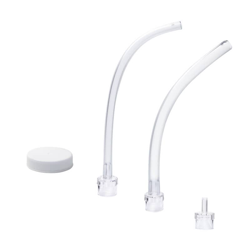 The suction pump is supplied in a set including two catheters and a disposable secretion container with closure and suction cap. The supplied catheters have the size CH 28 and 40, to allow you to choose the ideal container for the suction.