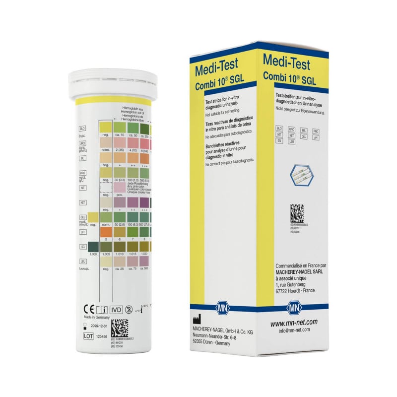 The Medi-Test Combi 10 SGL urine test strips are used for the quick and reliable diagnosis of various parameters, such as glucose, ketone bodies, nitrite or bilirubin. The test is very easy to perform and the result can be easily read by comparing the test strip with the colour scale on the tube. For a precise result, the test strips are vitamin C-depleted.