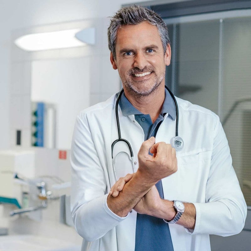 The slim-fit men's lab coat has practical stretch sleeves to make hand washing easier. The slim fit and the stand-up collar give the doctor's coat a modern look, while the material mix ensures exceptional comfort. Thanks to the silver inner collar, the fabric is protected from discolouration. In addition, the gown can be washed hygienically at up to 95° C and is available in numerous sizes.