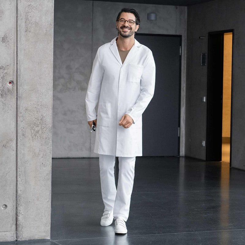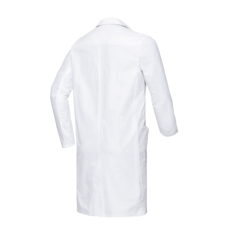 This slim-fit lab coat is made of 100 % cotton and can be washed hygienically at up to 95 °C. The classic lapel collar has a silver coating so that the material is reliably protected from discolouration. The long-sleeved coat with concealed press stud buttons and comfortable back slit has a breast pocket and two spacious side pockets. This fashionable doctor's coat is available in a wide range of sizes.