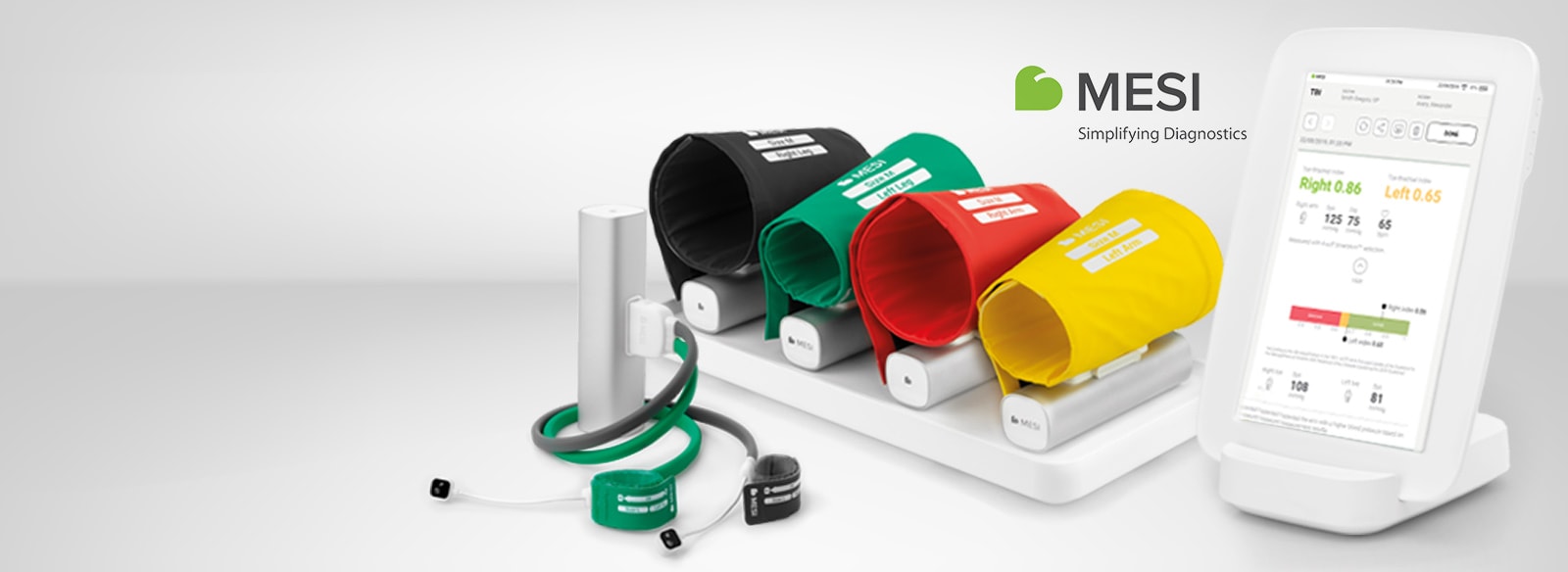 Expandable, wireless diagnostic system to measure the ankle-brachial index. Delivery includes charging station and MESI mTABLET.
