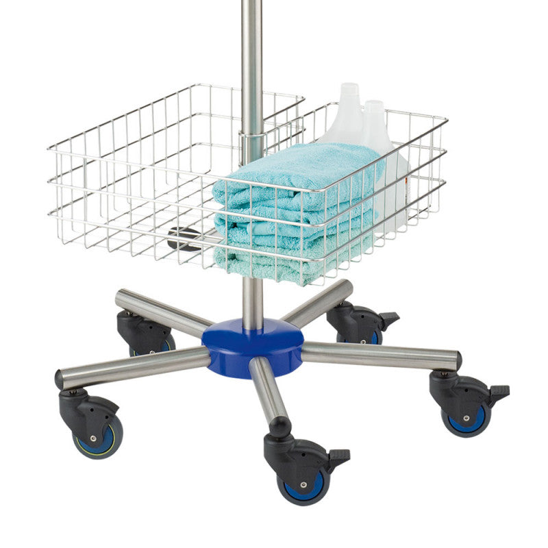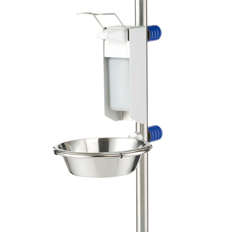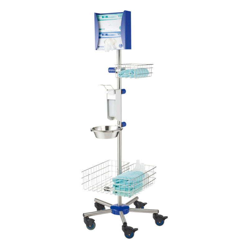 This mobile hygiene centre from Provita allows you to keep hygiene products and personal protective clothing on hand. For this purpose, the hygiene station is equipped with a disinfectant dispenser, drip tray, glove holder and 2 baskets for sterile items. Some of the castors on the robust, tip-proof stand are lockable, which allows the hygiene centre to be used anywhere where it is required. All components of the hygiene station are attached with quick release blocks or universal clamps so that they can be quickly and easily removed from the frame.