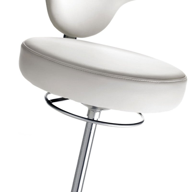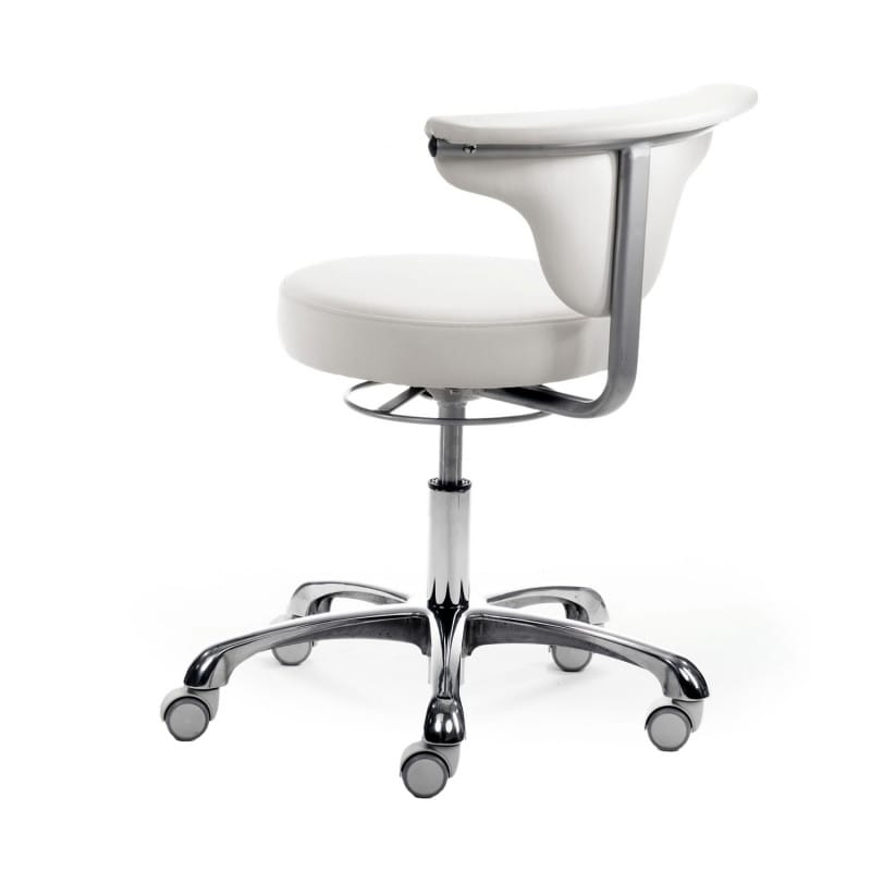 This modern multifunction stool has a backrest that can be rotated 360° around the seat and used as an armrest. The stool is equipped with a high-quality, glossy aluminum base and soft castors for hard flooring. The practical, height-adjustable multifunction stool is excellent for use in the lab and surgery.