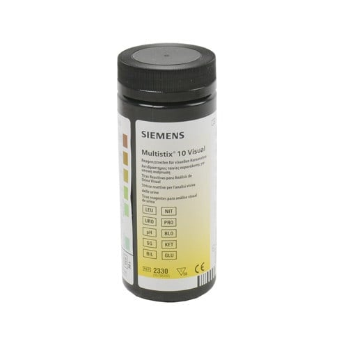 Multistix 10 visual urine test strips from Siemens Healthcare are suitable for visual analysis only. Thanks to their short shape and flexibility, the test strips can be used even with small sample quantities. The Multistix 10 visual test pads are ascorbic acid stabilised, which effectively prevents the occurrence of false measurement results.