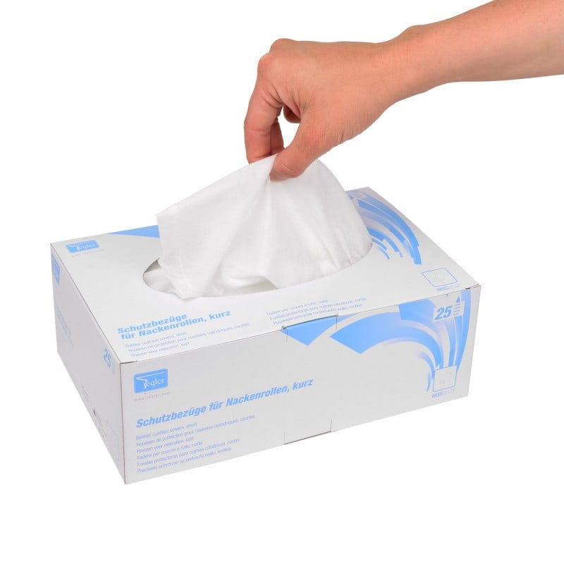 These 40 cm neck bolster cases are made of skin-friendly non-woven material and are particularly pleasant on the skin. Since these non-woven cases are replaced after each patient, they help prevent infectious transmissions. Furthermore, they increase comfort and protect the neck bolster from mechanical damage, e.g. from necklaces or earrings.