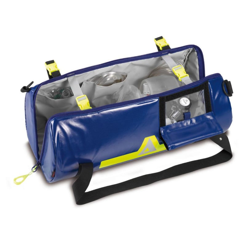The oxygen bag is made of the robust and hard-wearing PAX-Tec material and not only has two practical handles, but is also supplied with a shoulder strap. The attatched straps can be adjusted and serve to fix the bag to a stretcher or similar.
