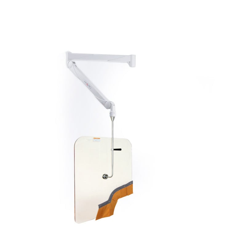 The Radiation Protective Shield OT94001 features a lamellar curtain that conforms perfectly to the patient's body, effectively reducing scattered radiation exposure. It can be easily removed and cleaned, similar to an X-ray apron. With a lead equivalent of Pb 0.50 mm and a total weight of 15.0 kg, this shield provides robust protection, while the extension arm and spring arm ensure flexible positioning.