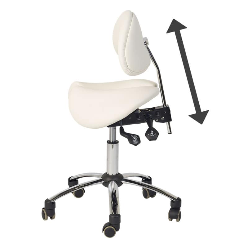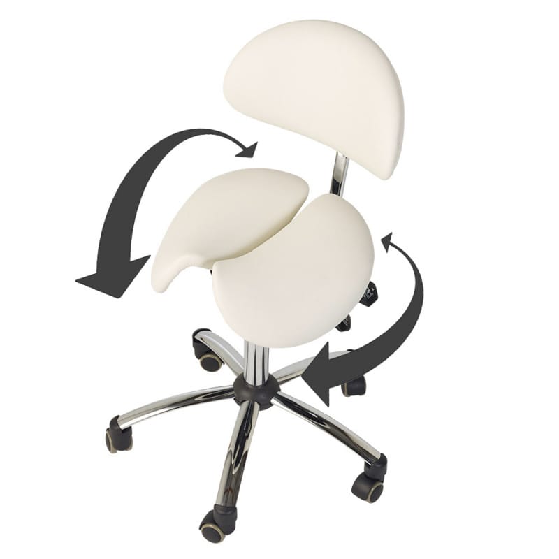 This saddle stool with backrest offers the perfect combination of high seated comfort and healthy posture. The upholstered surface is split into two sections to ensure that the body weight is evenly distributed across both seat halves. The saddle shape ensures that the natural pelvic and spinal positions are retained when seated. This minimizes pressure on the intervertebral discs and counteracts the occurrence of back problems.