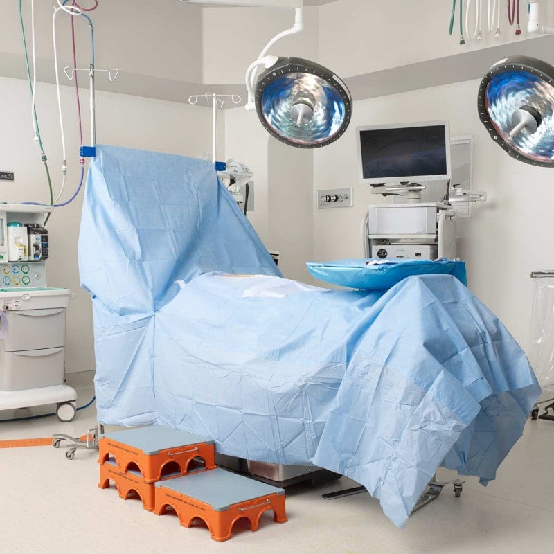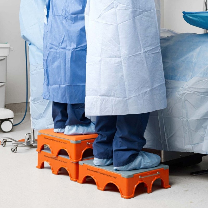 The stackable SANDEL® Ergo-Step™ foot step with padded tread avoids leg and foot fatigue during lengthy surgical procedures and reduces stress on muscles and joints.