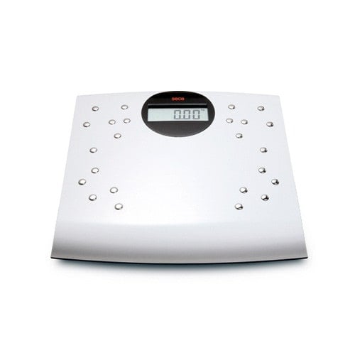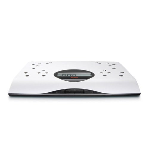 This intelligent analytical scale has 24 chrome-plated electrodes that provide permanent skin contact during measurement; thus making it possible to determine body fat and fluids. In order to assess the collected values, the analytical scale requires additional information (such as body height, gender, body type), which can be easily entered using the control panel before measurement. The seca 804 is also able to determine the patient's BMI by entering the gender and height. The analytical scale can store personal data for up to 4 different people. It can also weigh in "guest mode."