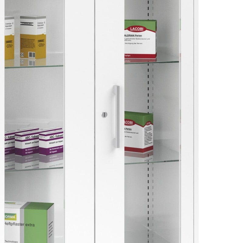 In addition to storing medicines, this medicine cabinet is ideal for clearly arranged storage of other practice supplies, such as dressing materials or dangerous utensils. The lockable glass doors allow direct viewing of your supplies and are made of single-pane safety glass, so that the medicine cabinet is additionally protected against unauthorised access. With a load capacity of 40 kg per glass shelf, the medicine cabinet shelf is also extremely robust.