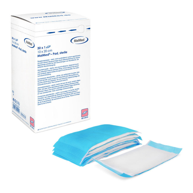 MaiMed® -Pad, sterile are wound-friendly, highly absorbent compresses. The compresses are completely closed and non-wound adhesive so that they can be easily detached from the wound. A special blue non-woven fleece prevents wound exudate seeping through, protecting linen and clothing. The sterile absorbent compresses are delivered individually wrapped in a practical dispenser carton.