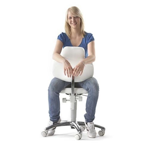 The Swivel Chair MYMAX provides multiple seated positions via the seat's special design e.g. for relief of the shoulder and neck muscles. The swivel chair has a hygienic, white synthetic leather upholstery cover and is equipped with hard floor castors.