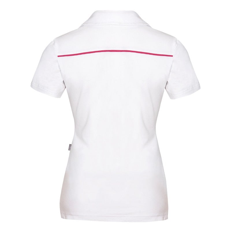 This fitted women's polo shirt from Edelweiss is made of comfortable stretch cotton fabric that feels pleasant against the skin and allows maximum freedom of movement. The jersey polo shirt has short sleeves as well as a collar and a V-neck. The shirt is available in a range of sizes with different colour accents.