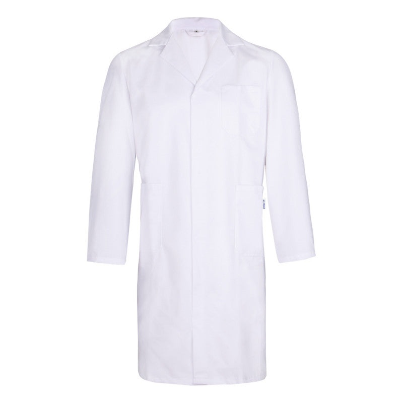 The white Taurus men's coat from Edelweiss with long sleeves and lapel collar is ideal for workplaces where there is a higher temperature due to its material composition of cotton and polyester. It features 5 concealed press studs, 3 patch pockets and a hidden mobile phone pocket.