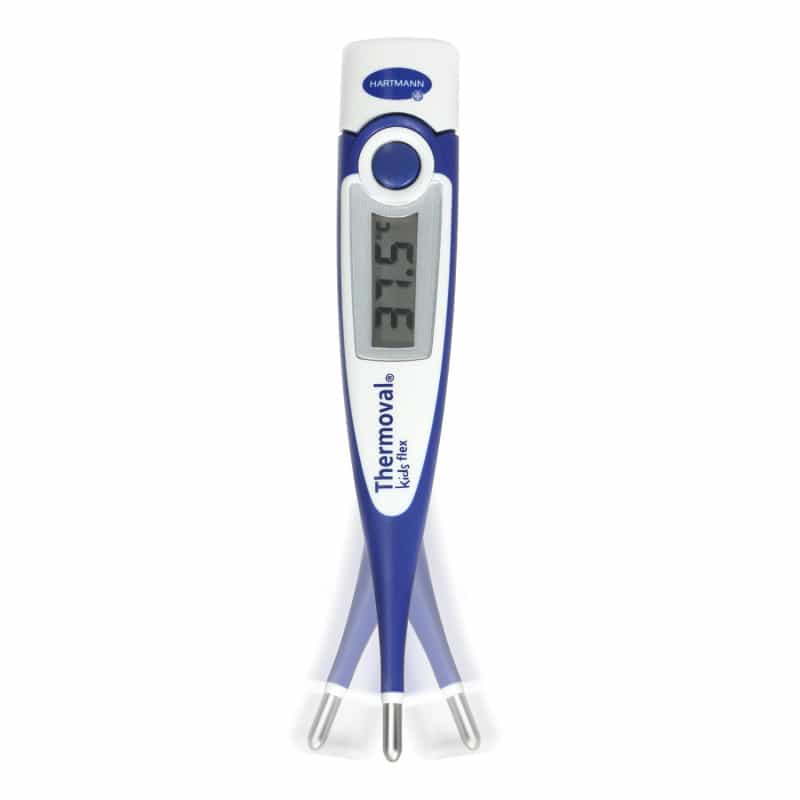 The Thermoval kids flex from Hartmann is a digital thermometer with a flexible measurement tip that is well suited for taking the temperature of babies and toddlers. The flexible tip prevents injuries, especially during rectal measurements, making the process somewhat more pleasant for the patient. The Thermoval kids flex measurement range is between 32 and 43,9 °C and the results are only available in Celsius.